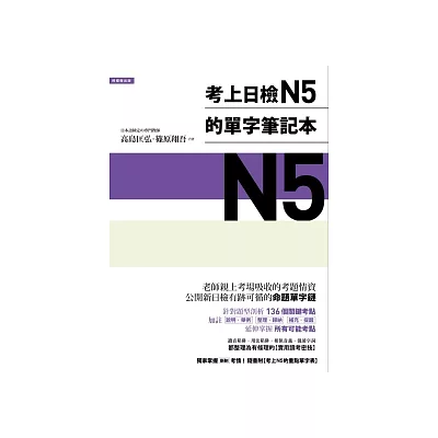 老師親上考場吸收的考題情資,公開新日檢有跡可循的【命題單字鏈】! 針對題型剖析【136個關鍵考點】,加註「說明.舉例」、「整理.歸納」、「補充.提醒」延伸掌握【所有可能考點】! 讀音陷阱.用法陷...more