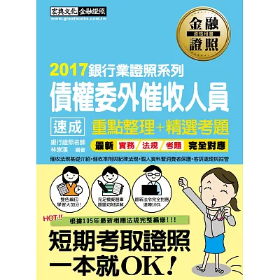 台灣銀行業實務名師「林崇漢」繼銀行內控與初階授信證照用書後又一嘉惠讀者新作!全書精美雙色編印,圖表豐富;並收錄豐富練習題庫與詳解,短期催收人員養成專用證照書! 本書為參加「債權委外催...more