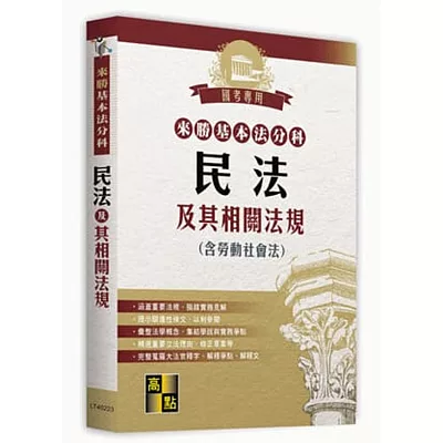 本書收錄重要法學概念、實務見解及最新民事法規,清楚剖析法條精義,充分理解修法動態,精心編整。重要且常用之法規及相關大法官釋字解釋文,輔以解釋爭點貼心設計,最適合法商學院在校生、法研所、國...more