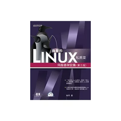 書附光碟DVD*1 「鳥哥的Linux私房菜」突破1千萬人次上網瀏覽,是最超人氣的Linux技術教學網站! 本書前兩版均蟬聯電腦專業書籍Linux暢銷排行榜,最新第三版榮耀上市! 書內範例均經由鳥哥...more
